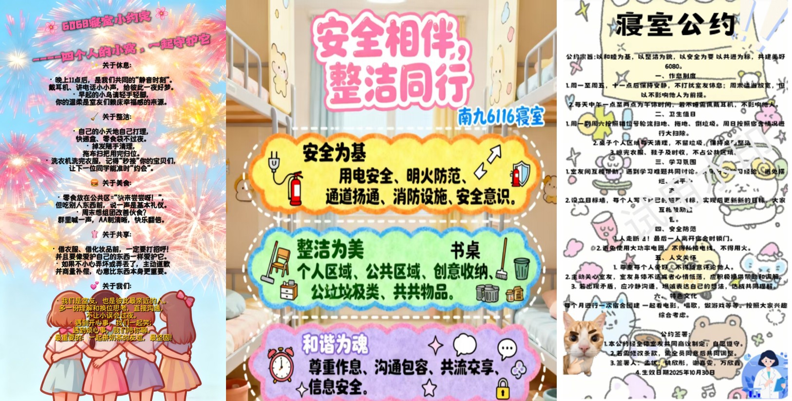 寝室是校园安全的关键阵地,也是学生们日常起居的核心空间。学院学生公寓管委会发起“寝室安全文明公约”践行倡议,明确禁止使用大功率电器、私拉乱接电线、存放易燃易爆物品等安全红线,倡导“勤通风、勤打扫、互监督、共维护”的文明住宿理念。各寝室代表现场签订承诺书,纷纷表示将自觉遵守安全规定,主动排查寝室安全隐患,共同营造安全、有序、和谐的住宿环境,让寝室成为师生在校期间的“安心巢”。为推动公约落地见效,学院还同步开展了寝室公约设计大赛,鼓励各寝室结合自身特点,设计个性化、接地气的公约内容;同时,学院定期组织学生志愿者成立安全巡查小组,定期深入寝室开展安全巡查,重点排查电路老化、违规用电、消防通道堵塞等潜在隐患,对发现的问题及时督促整改,切实将安全文明要求融入寝室日常管理的每一个细节。