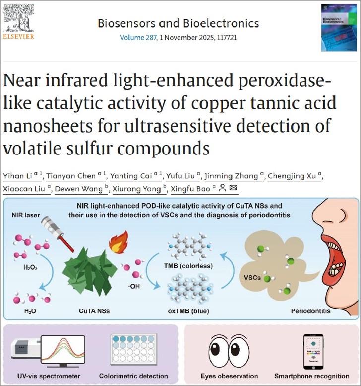 2025年11月,我院包幸福教授团队在中科院一区期刊《Biosensors and Bioelectronics》上发表了题为“Near infrared light-enhanced peroxidase-like catalytic activity of copper tannic acid nanosheets for ultrasensitive detection of volatile sulfur compounds”的研究。研究报道了一种新型的近红外光增强比色平台,用于与牙周病相关的挥发性硫化物(VSCs)的超灵敏检测,实现了宽线性范围和超低检测限的传感性能。