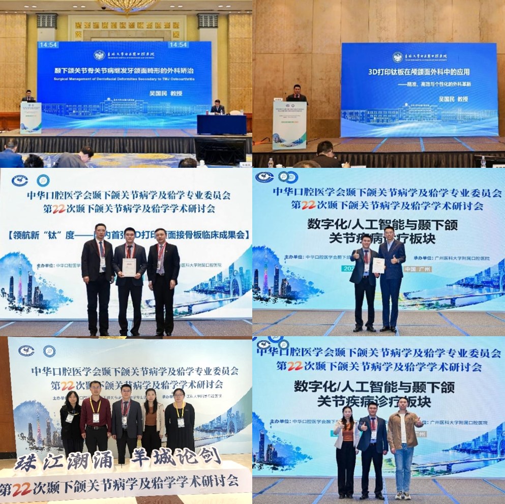 我院吴国民教授受邀作两场主题报告,分别以《颞下颌关节骨关节病继发牙颌面畸形的外科矫治》和《3D打印钛板在颅颌面外科中的应用—精准、高效与个性化的外科革新》为题,系统阐述了我院在颞下颌关节骨关节病继发牙颌面畸形诊治领域的临床成果与技术突破,分享了应用3D打印个性化钛板开展精准牙颌面畸形手术的经验。此外,我院学生团队以壁报展示形式,集中呈现了在颞下颌关节疾病领域的系列科研成果。此次参会全方位展现了我院学科团队的梯队建设实力与学术活力。