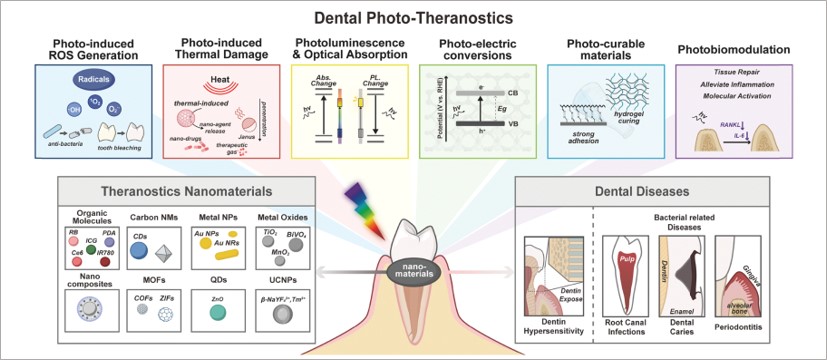 该综述系统梳理了在口腔诊疗领域中具有应用潜力的光响应纳米材料,详细介绍了其在治疗与诊断方面的代表性成果。文章重点分析了此类材料在光激发下的作用机理,评估其在疗效与转化潜力方面的优势。口腔因独特的解剖位置与组织特点,易接触外部光源,构成光触发治疗的理想环境,不仅有助于实现治疗的精准激活与控制,还能有效减少全身性暴露及相关副作用。同时,光响应技术凭借其无创、靶向性强以及高度时空可控的特性,能够实现对口腔疾病的高效局部干预,因而成为当前口腔医学研究的重要方向。同时,针对制约其材料应用的主要因素,如生物相容性、光穿透深度,以及口腔内复杂的微环境等,该综述进一步提出了下一代光诊疗平台的设计原则与治疗策略建议,旨在通过深度融合纳米技术与光学医学,为牙科疾病的精准管理与创新诊疗提供新路径与理论支撑。