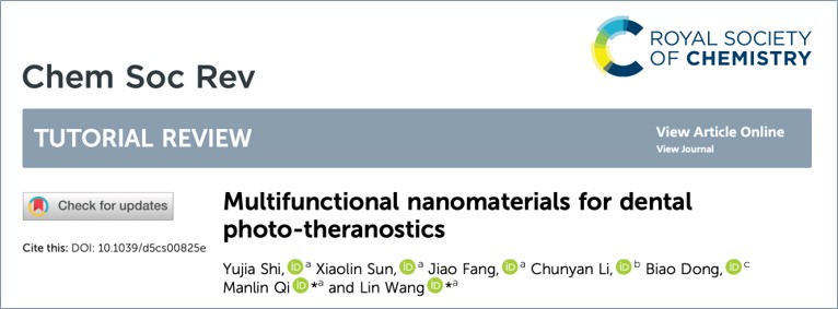 2025年11月,我院王林教授团队针对光响应性纳米材料的口腔应用发表综述,详细总结纳米材料介导的诊疗策略在牙科疾病管理的进展及潜力。相关成果以题目“Multifunctional nanomaterials for dental photo-theranostics”发表在《Chemical Society Review》(吉林大学C刊, 影响因子39.3)。本文第一作者施雨佳,现于吉林大学白求恩口腔医学院攻读博士学位,通讯作者为种植科王林教授以及齐曼霖主治医师。