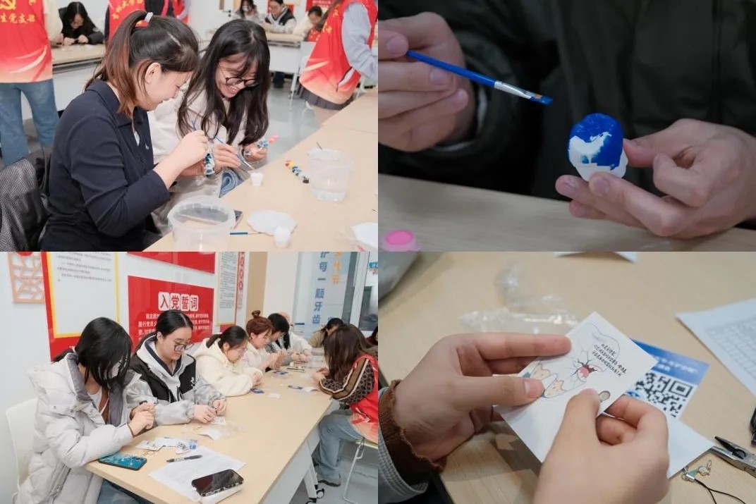 手工互动体验区成为师生们的“打卡热地”,牙齿石膏模型涂鸦和口腔科普主题书签制作两大活动前排起长队。同学们在医护志愿者的指导下,拿起彩笔为仿真牙齿模型描绘创意图案,在趣味涂色中直观认识门牙、犬齿、臼齿的形态与功能;书签制作区里,师生们挑选印有“口腔健康,全身健康”等标语的模板,搭配可爱的牙齿卡通贴纸,亲手制作专属护齿书签。“平时学习忙,很少关注口腔健康,这次手工活动让我记住了不少护齿知识,书签还能用作学习标记,特别实用”,一位参与活动的大二学生分享道。