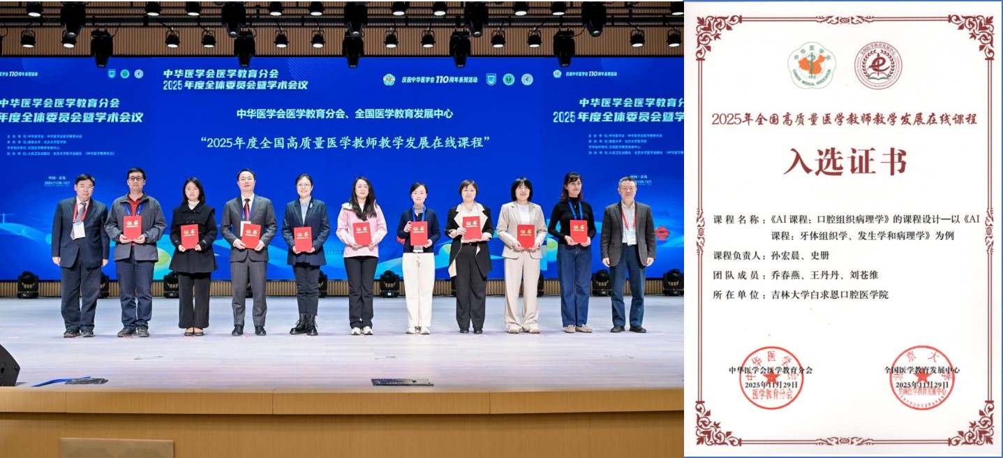 2025年11月29日-30日,中华医学会医学教育分会2025年全体委员会暨学术年会在山东青岛隆重召开。我院孙宏晨、史册教授团队倾力打造的课程“《AI课程:口腔组织病理学》的课程设计——以《AI课程:牙体组织学、发生学和病理学》为例”成功入选2025年“全国高质量医学教师教学发展在线课程”。口腔病理学教学团队在孙宏晨教授和史册教授的带领下,针对学生口腔组织病理学课程内容认知体系建构断层、学生能力体系建构与迁移不足、引导学生个性化学习与差异化评价不足等问题,具体以“牙体组织学、发生学和病理学及其临床意义”为例,系统阐释牙体组织的正常结构(组织学)、胚胎发育规律(发生学)及病理改变(病理学),帮助学习者建立“结构-功能”“正常-异常”的认知,为理解牙体组织相关疾病的本质奠定基础。通过临床案例将基础理论与临床实际密切联系,引导学习者深入理解“为什么会有这样的理化和生物学特性”“为什么会有这样的临床症状和体征”“为什么会有这样的发生发展过程”“为什么会有不同的治疗原则”,培养学生临床思维的高阶认知,推动口腔医学从“经验型”向“循证型”升级,助力解决临床实际问题。教学团队通过编写多模态的教学案例,运用人工智能与知识图谱等教育技术,创新了人才培养模式、提升了教学的质量与效果。通过能力图谱、问题图谱、知识图谱搭建立体化课程知识结构,推动了课程知识图谱化、教学设计结构化、课程要素数字化及教育教学智能化。利用人工智能分析学生学习情况,使学生能够获得个性化的学习建议和路径,解决个性化教学和学习不足的问题。通过AI技术与专业教学的深度融合,打破传统的专业壁垒,紧密衔接基础理论并应用于解决临床实际问题。