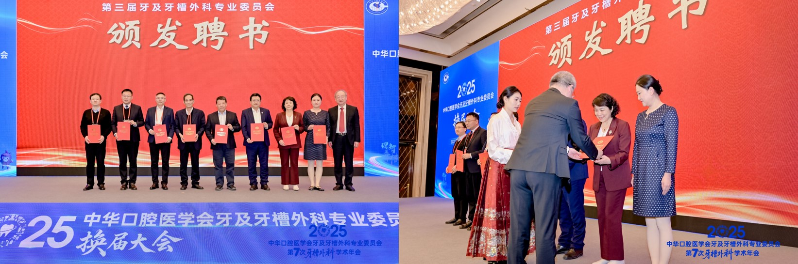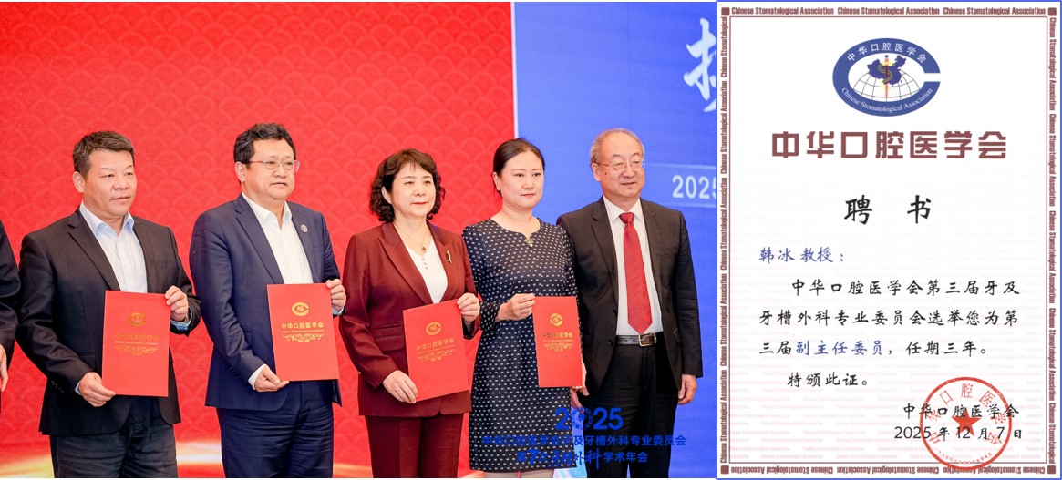 2025年12月7日,中华口腔医学会牙及牙槽外科专业委员会换届大会在陕西西安隆重举行。经严格审议与民主选举,我院韩冰教授成功连任中华口腔医学会第三届牙及牙槽外科专业委员会副主任委员。此次连任,不仅是对韩冰教授个人专业能力与学术贡献的充分肯定,也彰显了我院在牙及牙槽外科领域的深厚积淀。