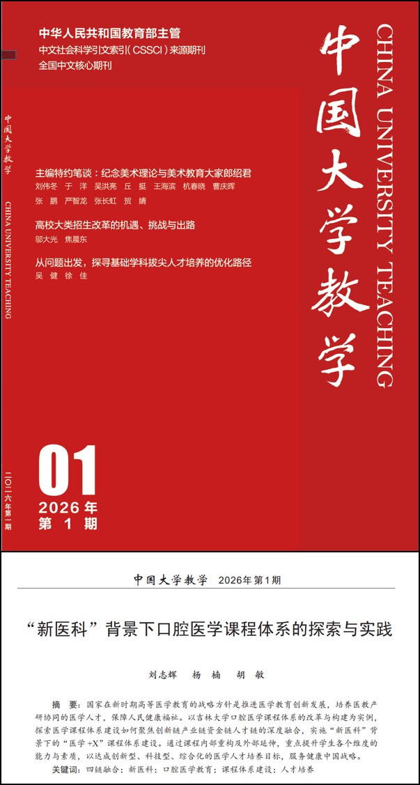 近日,我院刘志辉、杨楠、胡敏团队撰写的《“新医科”背景下口腔医学课程体系的探索与实践》一文,在国内高等教育领域权威期刊《中国大学教学》(CSSCI来源期刊)发表,标志着学院“十四五”期间口腔医学教育改革实现从实践探索到理论升华的重要跨越。