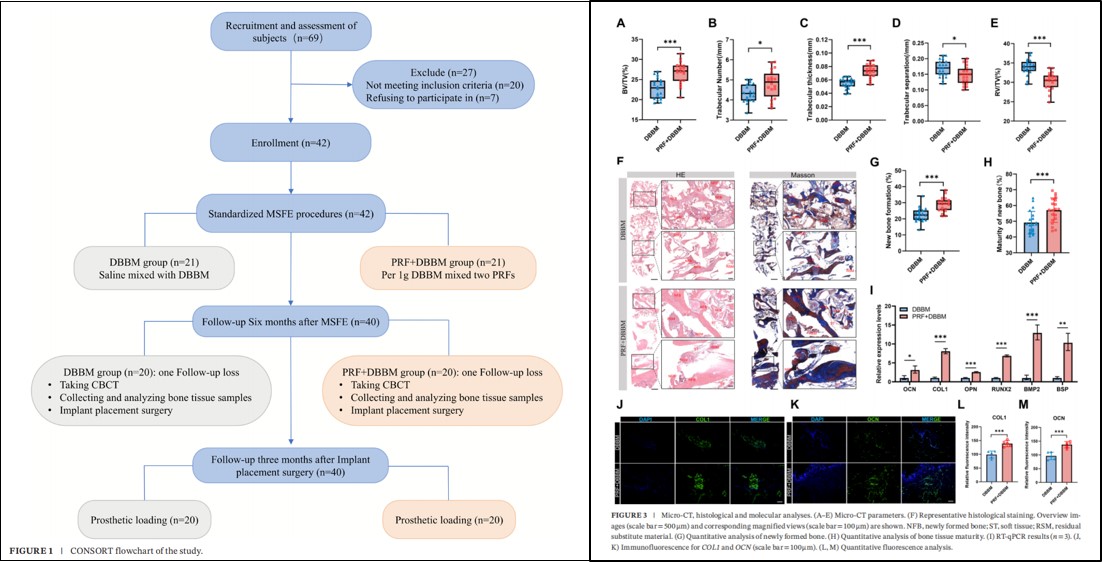 为此,周延民教授团队开展了一项高质量随机对照研究(2023-2025年)。研究最终纳入42名上颌窦底骨高度<4mm的患者,经随机分组后,最终40例(每组20例)完成随访并纳入分析。在标准化MSFE术后6个月,研究人员从临床、影像学、组织学及分子层面对骨再生情况进行了综合评估,并创新性地运用蛋白质组学分析联合蛋白质印迹验证,探究PRF促进上颌窦骨再生的信号通路。