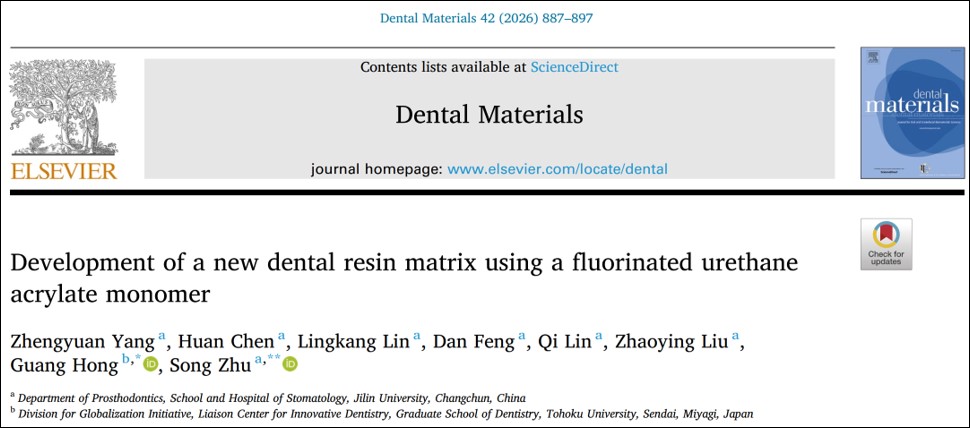 近日,我院口腔修复科朱松教授团队与日本东北大学牙科学院洪光教授团队合作,在牙科树脂材料研发领域取得重要进展。他们自主设计合成了一种新型含氟聚氨酯丙烯酸酯单体(FPUA),该单体在口腔树脂领域展现出了良好的应用潜力,可用于研发兼具良好物理化学性能和抗细菌粘附特性的新树脂材料。相关成果以论文题为“Development of a new dental resin matrix using a fluorinated urethane acrylate monomer”发表于国际口腔医学领域顶级期刊《Dental Materials》。