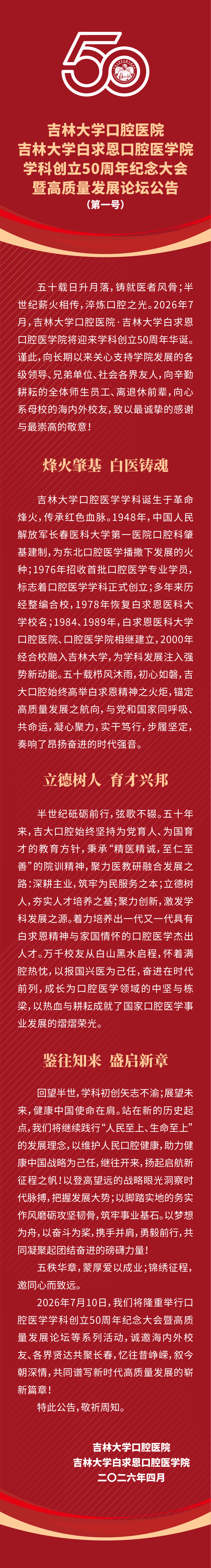 吉林大学口腔医院·吉林大学白求恩口腔医学院学科创立50周年纪念大会暨高质量发展论坛公告(第一号)