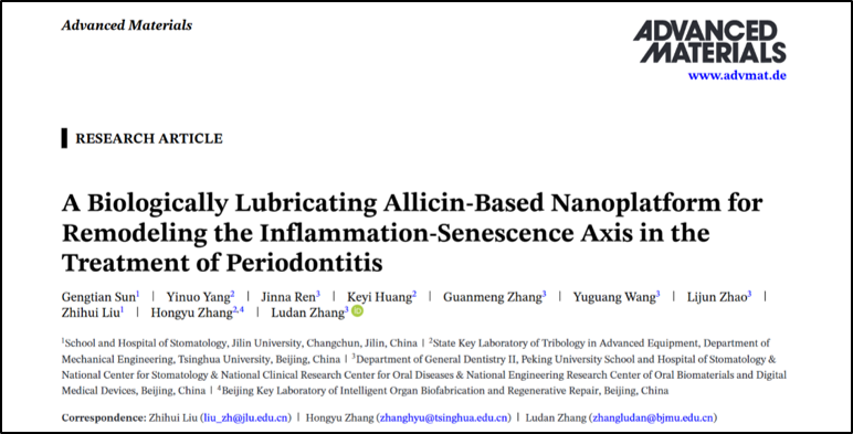 2026年3月,我院刘志辉教授团队与清华大学张洪玉、北京大学张栌丹团队携手,受“堡垒效应”启发,开发基于大蒜素的生物润滑纳米平台(PPCG),通过构建物理润滑屏障和生物活性屏障双重防护系统,同时实现抗细菌粘附、抗炎和抗衰老的多重干预,有效治疗牙周炎。该成果以“A Biologically Lubricating Allicin-Based Nanoplatform for Remodeling the Inflammation-Senescence Axis in the Treatment of Periodontitis”为题,发表于中科院一区Top期刊《Advanced Materials》。本文第一作者孙耕天,现于吉林大学白求恩口腔医学院攻读博士学位。