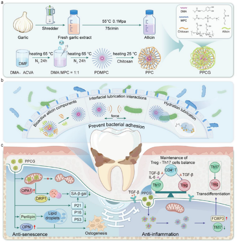 本研究基于“堡垒效应”理念,构建了一种集物理屏障与生物调控于一体的蒜素基生物润滑纳米平台PPCG。该平台通过外层PDMPC形成稳定水化润滑层,有效抑制细菌黏附和生物膜形成;同时通过内层蒜素持续释放,调控干细胞功能、抑制炎症反应并延缓细胞衰老,从而打破“炎症-衰老”恶性循环。在体内实验中,PPCG显著改善牙周炎相关骨破坏并促进组织再生,表现出良好的治疗效果与生物安全性。该研究为牙周炎治疗提供了一种全新的多机制协同策略,也为复杂炎症性疾病的微环境调控提供了重要参考。