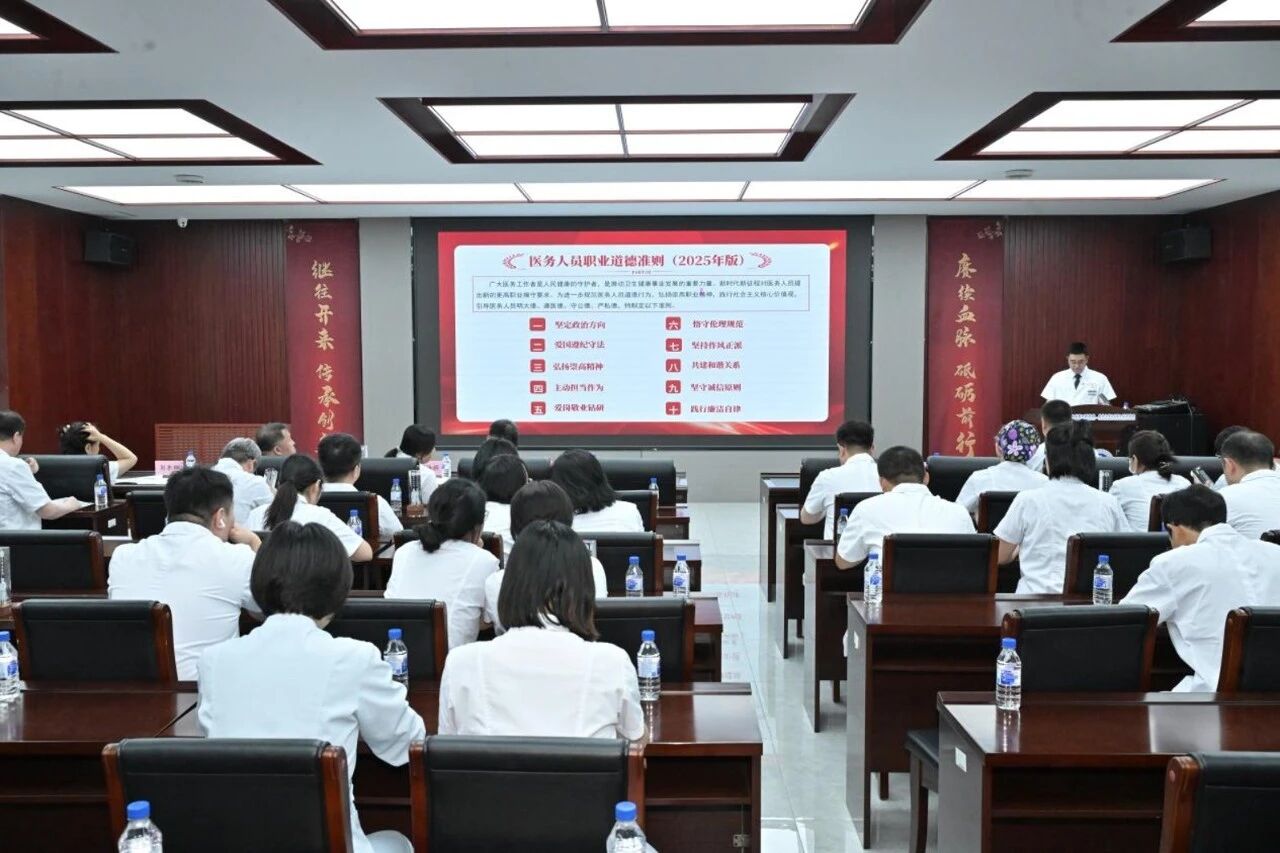 吴国民副院长带领全院医务工作者深入学习《医务人员职业道德准则(2025年版)》,强调要明大德、遵医德、守公德、严私德,永怀救苦之心,新修订的《准则》是医务人员的行为标尺,全院上下要切实提高职业道德修养,将准则要求融入日常诊疗、教学和科研工作,以高尚医德和精湛医术守护人民健康,推动医院高质量发展。