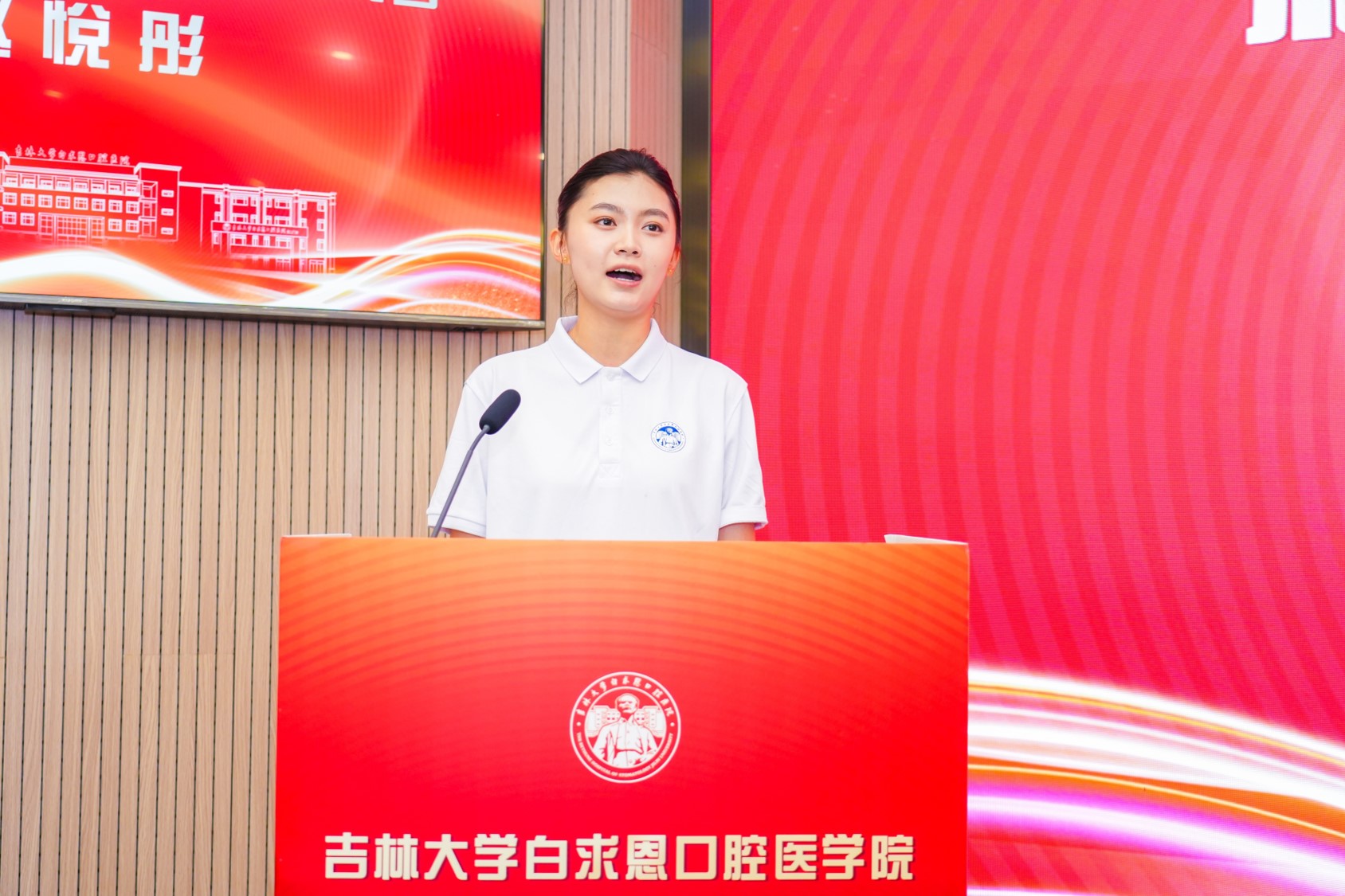 国歌余韵中,新生代表发言点燃现场热情。2025级本科生代表赵悦彤分享初入校园时被“白求恩”精神触动的感受,她承诺将以“空杯心态”全身心投入学习,筑牢专业根基,把解除患者口腔病痛作为毕生追求,努力成长为能扛起传承白求恩精神大旗的口腔医者。