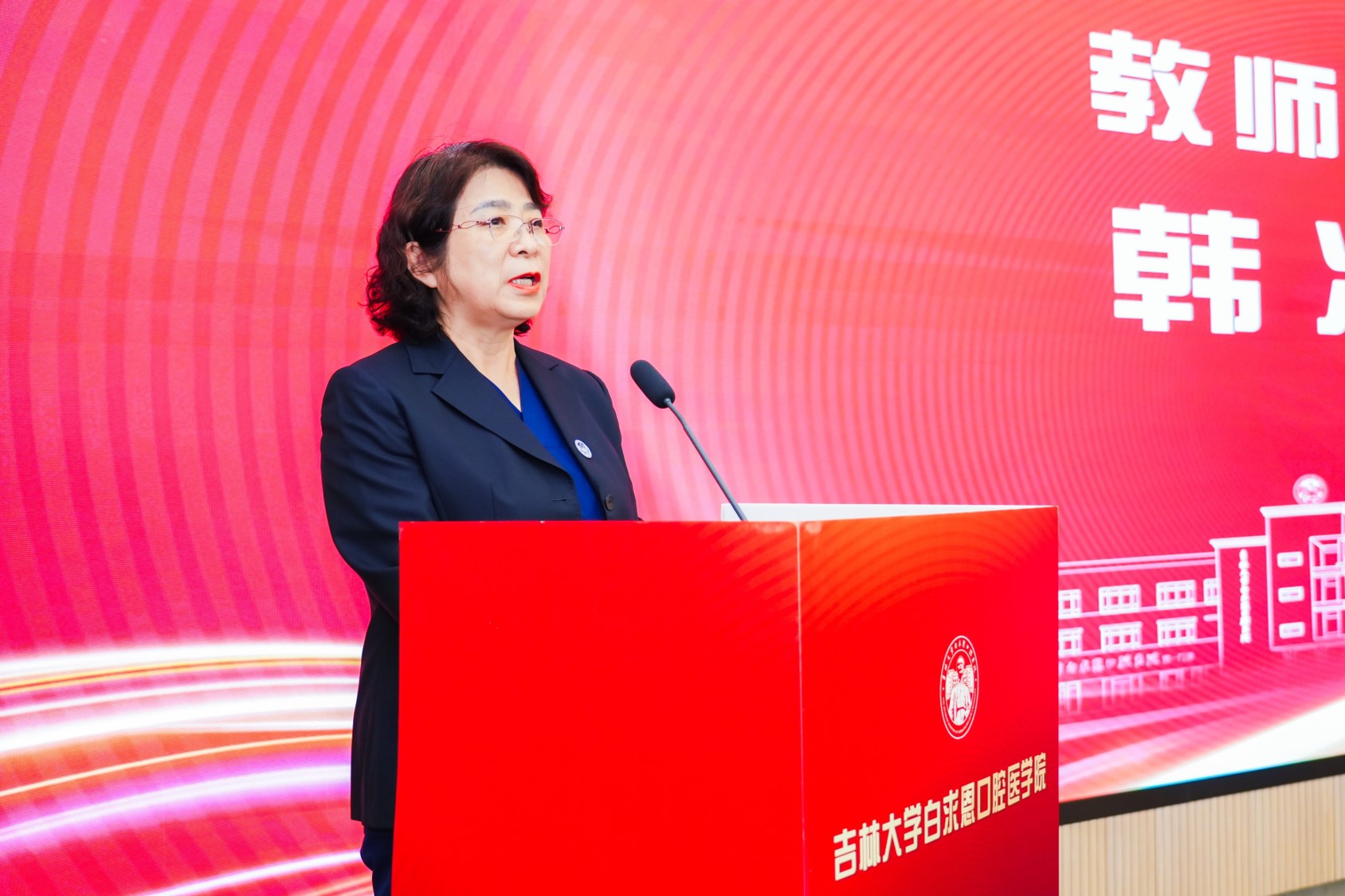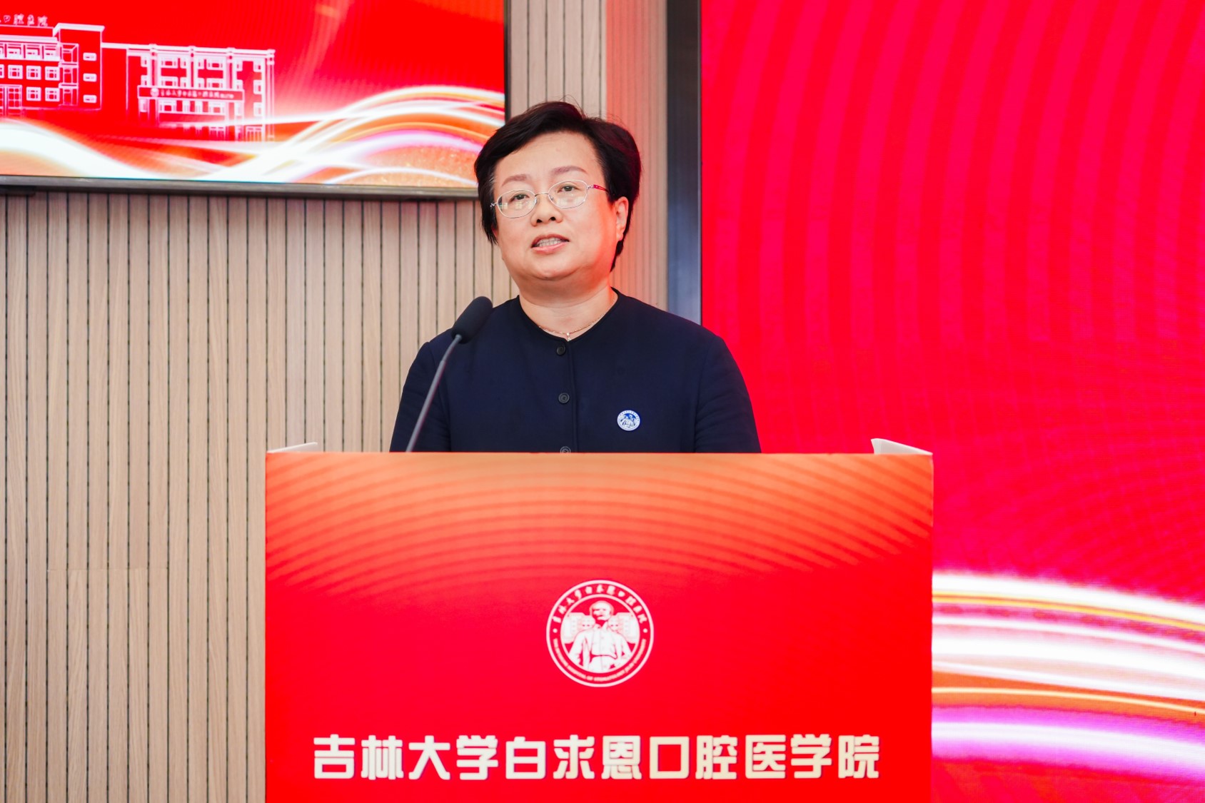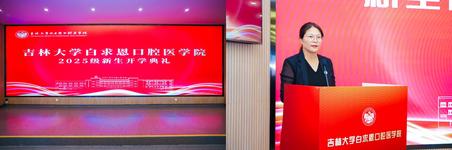 学院党委书记胡敏教授致辞,为新生们的启航之路注入强劲动力。她首先代表学院全体师生员工,向怀揣医学梦想的2025级新同学表示最热烈的欢迎。胡敏书记特别提到,当前学院正站在即将迎来建院五十周年的重要历史节点,在这一特殊时刻,她向新生们提出三点殷切期望:以“精医精诚”立基:要紧跟医疗技术前沿,主动打破理论与实践的壁垒、知识与创新的界限,加快实现从“学会”到“会用”、从“掌握”到“创造”的转变;以“至仁至善”铸魂:要始终尊重每一个生命个体,在提升学问的同时涵养医德,在救死扶伤的过程中传递温暖,努力成为既有“医术”又有“仁心”的医者;以“红色基因”赋能:要深刻领悟并传承白求恩精神,将勤学笃行作为日常准则,将扎根奉献作为价值追求,把个人理想融入健康中国建设的伟大事业,用青春力量守护人民口腔健康。