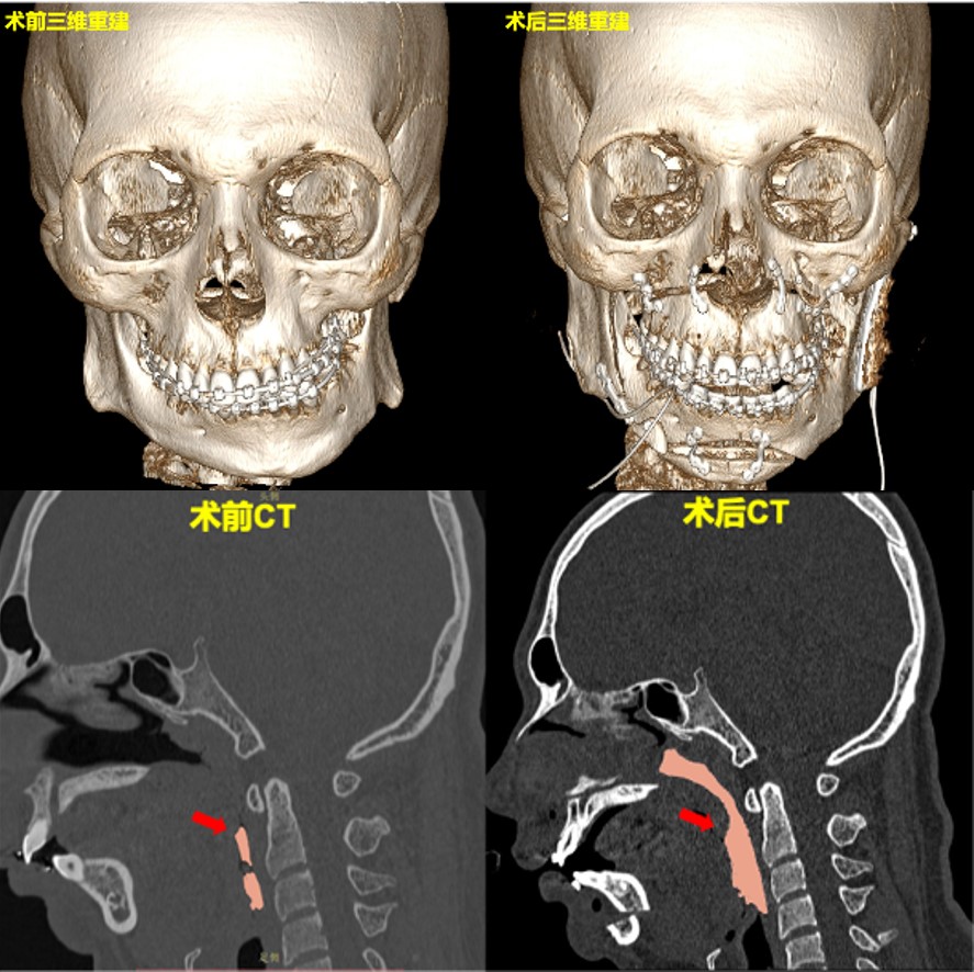 术后,患者自觉通气顺畅,睡觉时无憋气,家属诉患者打鼾明显缓解。检查可见面部对称性良好,关节运动正常,咬合关系稳定。螺旋CT显示,气道显著扩张。