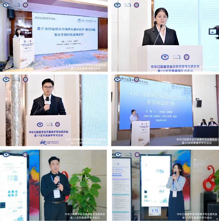 牙周病学教研室研究生刘晓凡、王宇轩、郭梦茹、刘金茹分别于高水平论文、基础研究和临床研究会场做《基于油相锰掺杂白磷钙石纳米粒子/聚己内酯复合支架的促成骨研究》、《负载HUVEC外泌体的水凝胶缓释体系通过成骨-成血管偶联通路促进骨组织再生》、《pH响应型可注射二甲双胍水凝胶的合成及其通过AMPK/Nf-κB通路调控宿主免疫治疗牙周炎》、《牙周-牙髓联合病变伴牙合创伤的多学科治疗1例》报告,从多个方面展示我院牙周病学团队的研究成果。此外,还有多位牙周科研究生参加了本次现场临床壁报展示。
