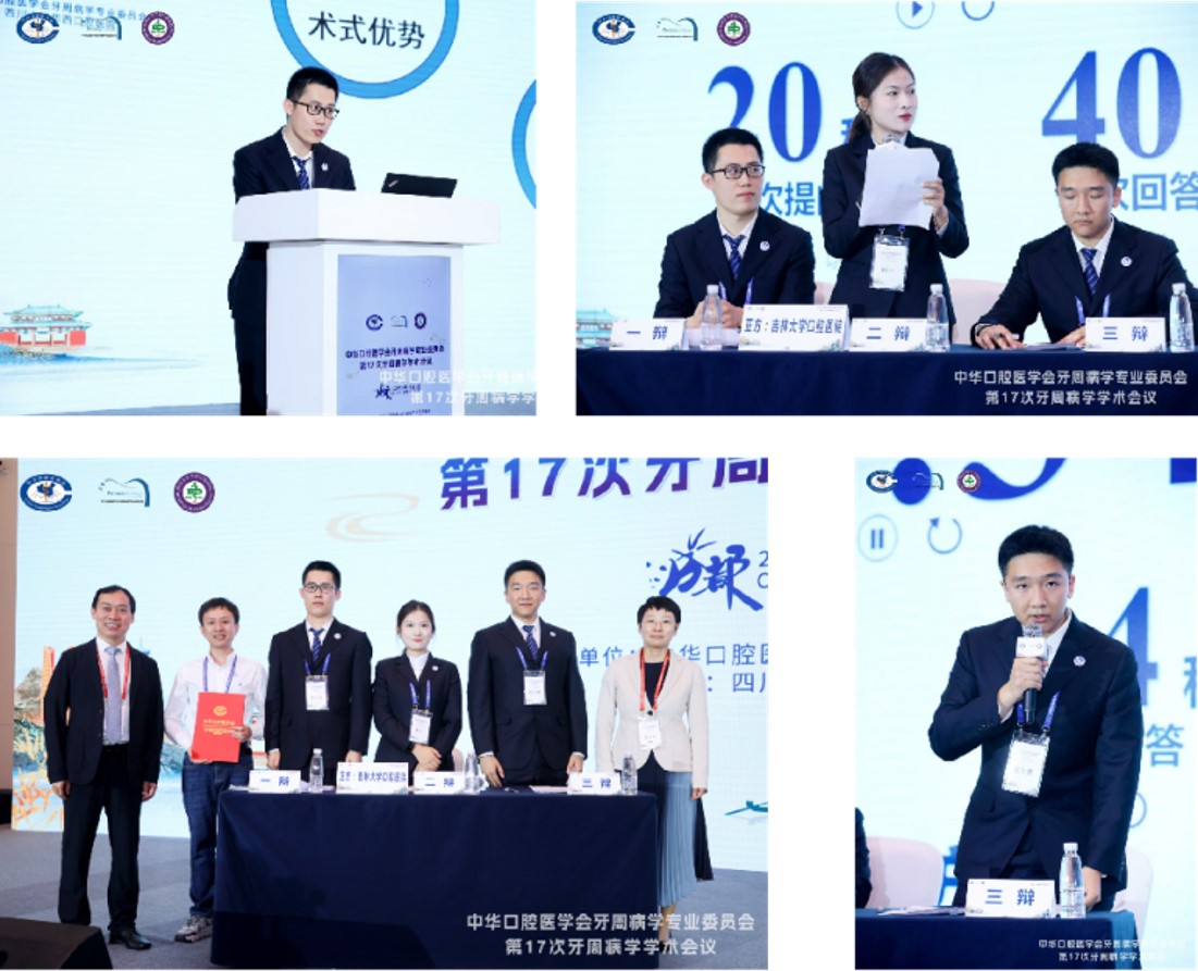 牙周思辨会是本次会议的特色版块,由牙周病学教研室的张天翼、刘向龙、桓宇3名研究生组建的“龈锋之上”辩论队(指导教师徐文洲、郑义)在关于《对于游离结缔组织移植,SCTG和dFGG哪种更适合?》的辩题讨论中,巧思迎战、随机应变、饱含激情,他们字字珠玑的辩词获得观众阵阵热烈的掌声。