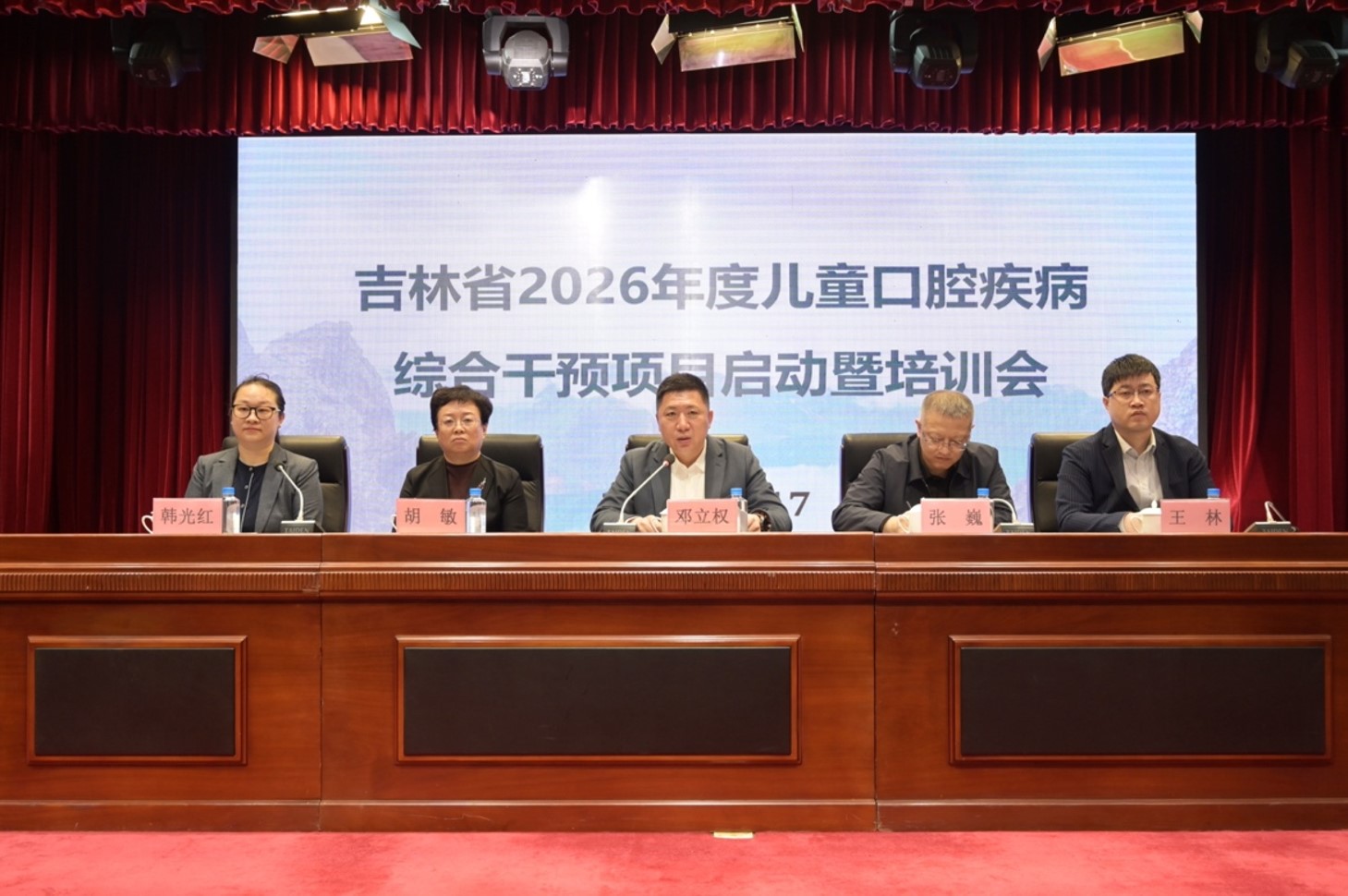 吉林省卫生健康委党组成员、副主任邓立权,吉林省卫生健康委医疗应急与监督处处长张巍,吉林大学口腔医院党委书记兼吉林省牙防办主任胡敏教授,吉林大学口腔医院院长王林教授出席会议,会议由吉林省牙防办副主任韩光红主持。启动仪式上邓立权副主任发表讲话,阐明了儿童口腔疾病综合干预项目的民生价值与意义。他对参会的各区县项目办及医护人员提出明确工作要求,强调各级各部门要切实增强政治意识、大局意识、责任意识和服务意识,坚守“为群众办实事、办好事”的初心,加强统筹协调、密切协同配合,加快推进项目落地见效;同时要强化全过程监督检查,严把质量关,确保项目实施规范有序、高质高效,真正把民生实事办实、把惠民举措落地,切实提升全省儿童口腔健康水平。王林院长代表吉林省牙防办致辞,他再次强调了儿童口腔健康对于成长发育的深远意义——口腔健康是全身健康的关键一环,儿童时期更是培养良好口腔习惯、防控龋齿的黄金阶段,当前我国儿童龋病呈现低龄化、重度化趋势,守护儿童口腔健康刻不容缓;新一年项目工作将严格遵循“预防为主、防治结合”的健康方针,深入贯彻国家《儿童青少年“五健”促进行动计划(2026-2030年)》要求,推动全省各地市切实落实各项工作任务,把口腔健康服务延伸到基层、覆盖到每个家庭,让每一位孩子都能拥有健康的牙齿。